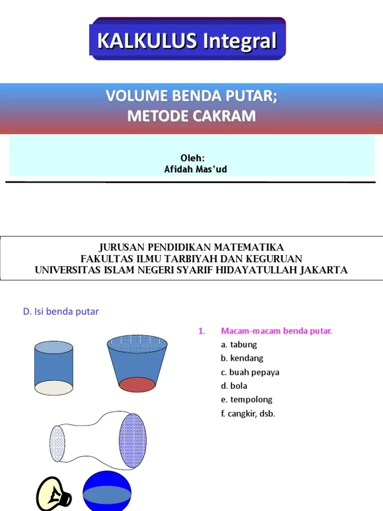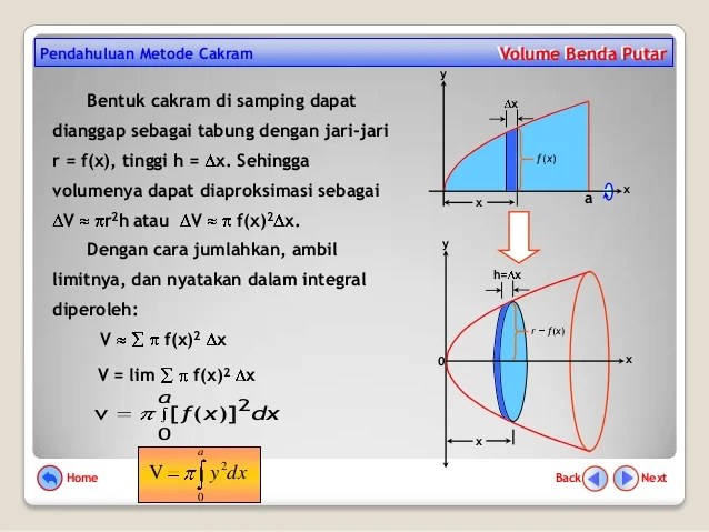 Makalah kalkulus volume benda putar disusun oleh 1. Lihat soal 9 untuk mensketsa bukti dari rumus tersebut. Hitunglah volume benda putar yang terjadi jika daerah yang dibatasi kurva y = x2 + 1, . Volume benda pejal/padat yang terjadi dapat . Volume benda putar dengan metode cakram perhatikan gambar berikut : Metode cakram yang digunakan dalam. Ada cara mudah untuk mengingat rumus volume di atas. Perhatikan bahwa ketika kulit tabung itu kita potong sepanjang garis yang sejajar sumbu simetri . Untuk menghitung volume benda putar gunakan pendekatan iris, hampiri, jumlah, dan ambil limitnya. Menentukan volume benda putar menggunakan metode cakram. Metode cakram diputar terhadap sumbu x volume benda putar contoh 1. Misal daerah dibatasi oleh y = f(x), y = 0, x = a dan x = b diputar dengan sumbu putar sumbu x. Tentukan volume benda putar yang terjadi jika daerah r yang dibatasi oleh.